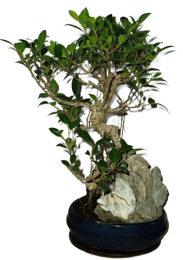 Ficus retusa - fíkovník je klasická pokojová bonsaje o výšce stromu 44 cm a stáří 10 let. Stačí jim polostín, či šero, pouze nesnáší průvan a studenou vodu.
