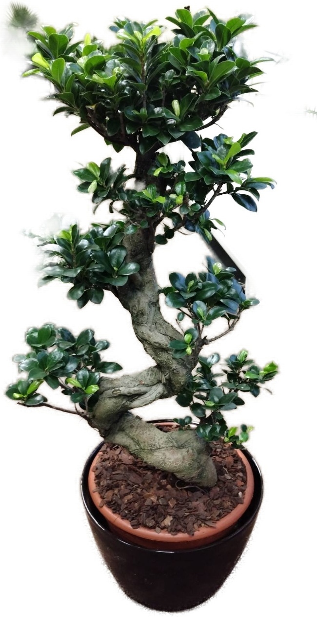 Ficusy ginsengy jsou pokojové bonsaje, které nevyžadují žádnou péči, zálivka je velmi sporadická jednou za čas po celkovém vyschnutí. Výška pokojové bonsaje je 75 cm včetně květináče a průměr misky 27 cm.