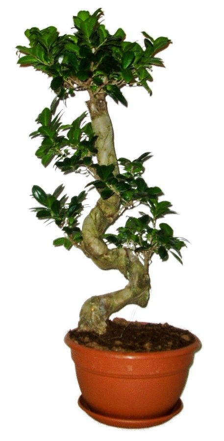 Ficusy ginsengy jsou pokojové bonsaje, které nevyžadují žádnou péči, zálivka je velmi sporadická jednou za čas po celkovém vyschnutí. Výška pokojové bonsaje je 83 cm včetně květináče a průměr misky 27 cm.