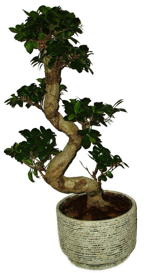 Ficusy ginsengy jsou výborné pokojové bonsaje, které nevyžadují žádnou péči, zálivka je velmi sporadická jednou za čas po celkovém vyschnutí. Výška pokojové bonsaje je 74 cm, stáří 15 let.