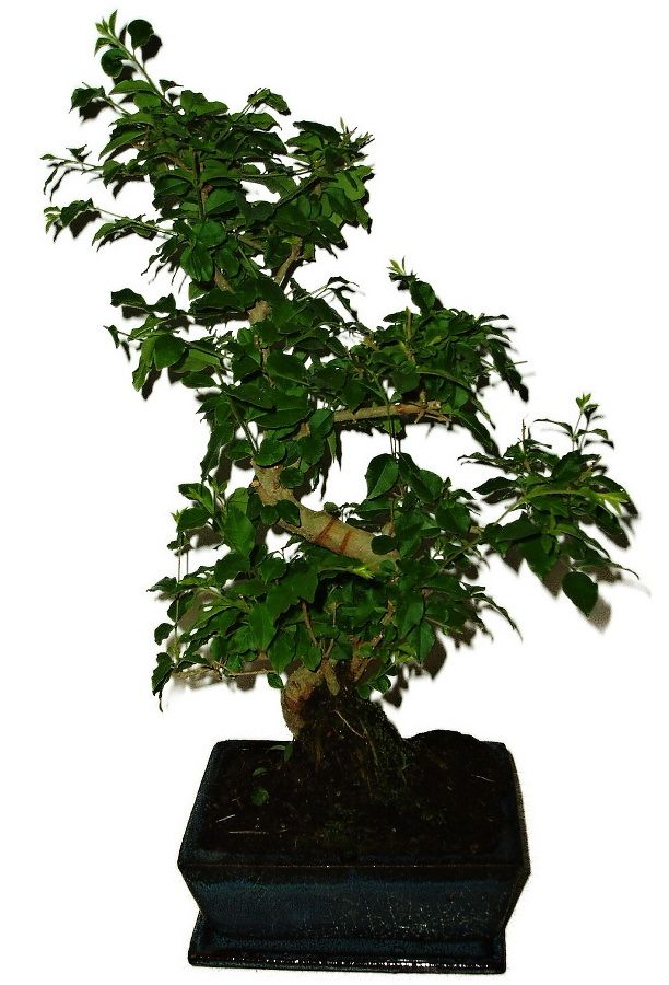 Bonsaj Ligustrum Chinensis, známá také jako ptačí zob čínský, je oblíbená pro své lesklé zelené listy a schopnost produkovat atraktivní bílé květy. Výška bonsaje 39 cm, stáří bonsaje 6 let.