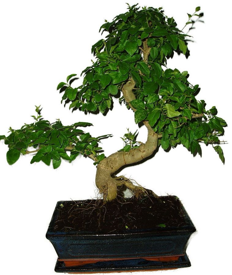 Bonsaj Ligustrum Chinensis, známá také jako ptačí zob čínský, je oblíbená pro své lesklé zelené listy a schopnost produkovat atraktivní bílé květy. Výška bonsaje 44 cm, výška, stáří bonsaje 10 let.
