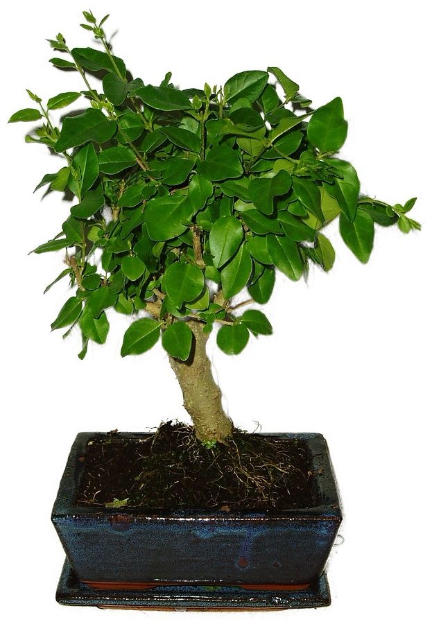 Bonsaj Ligustrum Chinensis, známá také jako ptačí zob čínský, je oblíbená pro své lesklé zelené listy a schopnost produkovat atraktivní bílé květy. Výška bonsaje 28 cm, výška, stáří bonsaje 5 let.