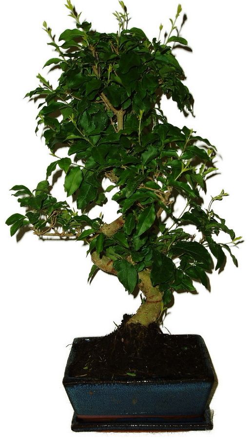 Bonsaj Ligustrum Chinensis, známá také jako ptačí zob čínský, je oblíbená pro své lesklé zelené listy a schopnost produkovat atraktivní bílé květy. Výška bonsaje 42 cm, stáří bonsaje 6 let.