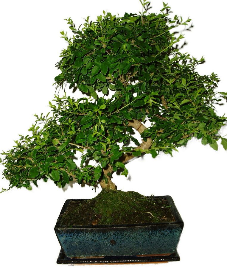 Bonsaj Ligustrum Chinensis, známá také jako ptačí zob čínský, je oblíbená pro své lesklé zelené listy a schopnost produkovat atraktivní bílé květy. Výška bonsaje 46 cm, stáří bonsaje 10 let.
