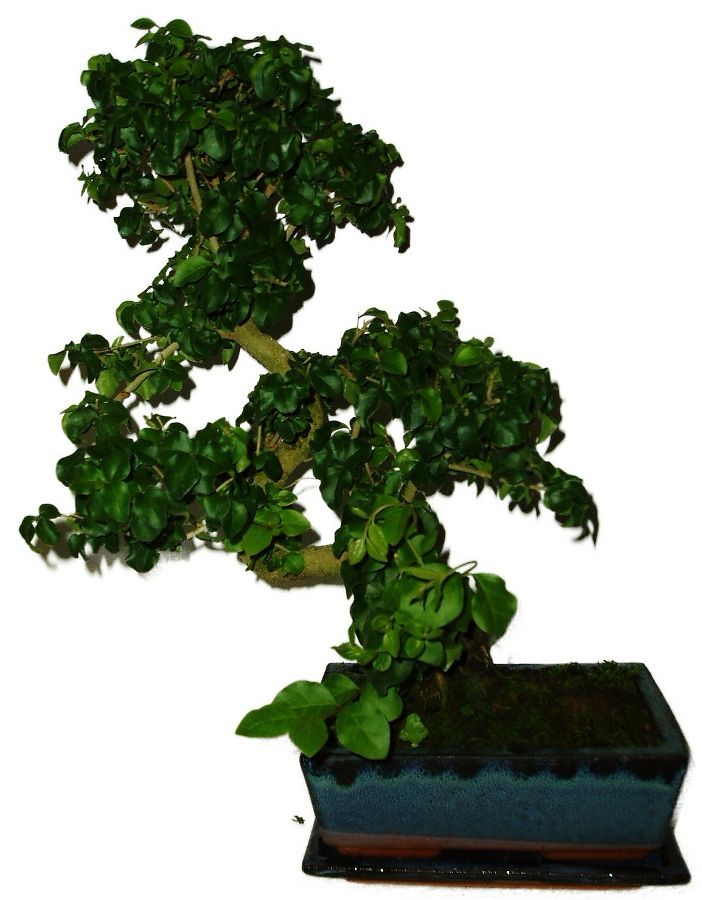 Bonsaj Ligustrum Chinensis, známá také jako ptačí zob čínský, je oblíbená pro své lesklé zelené listy a schopnost produkovat atraktivní bílé květy. Výška bonsaje 40 cm, stáří bonsaje 8 let.