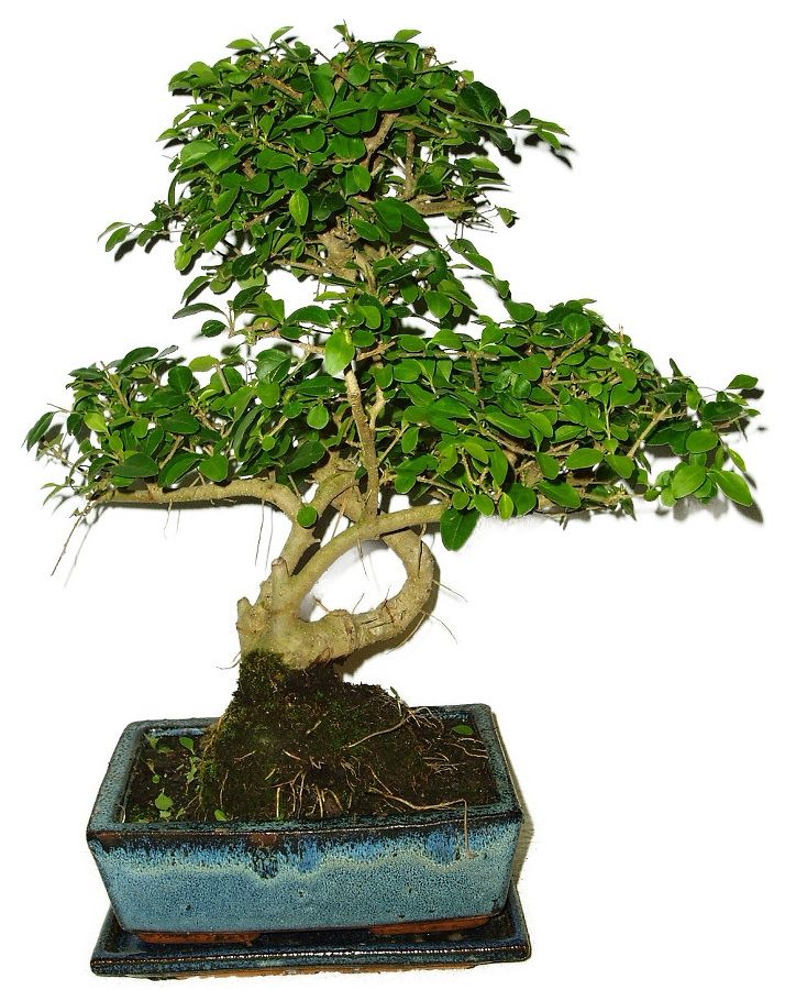 Bonsaj Ligustrum Chinensis, známá také jako ptačí zob čínský, je oblíbená pro své lesklé zelené listy a schopnost produkovat atraktivní bílé květy. Výška bonsaje 36 cm, stáří bonsaje 8 let.