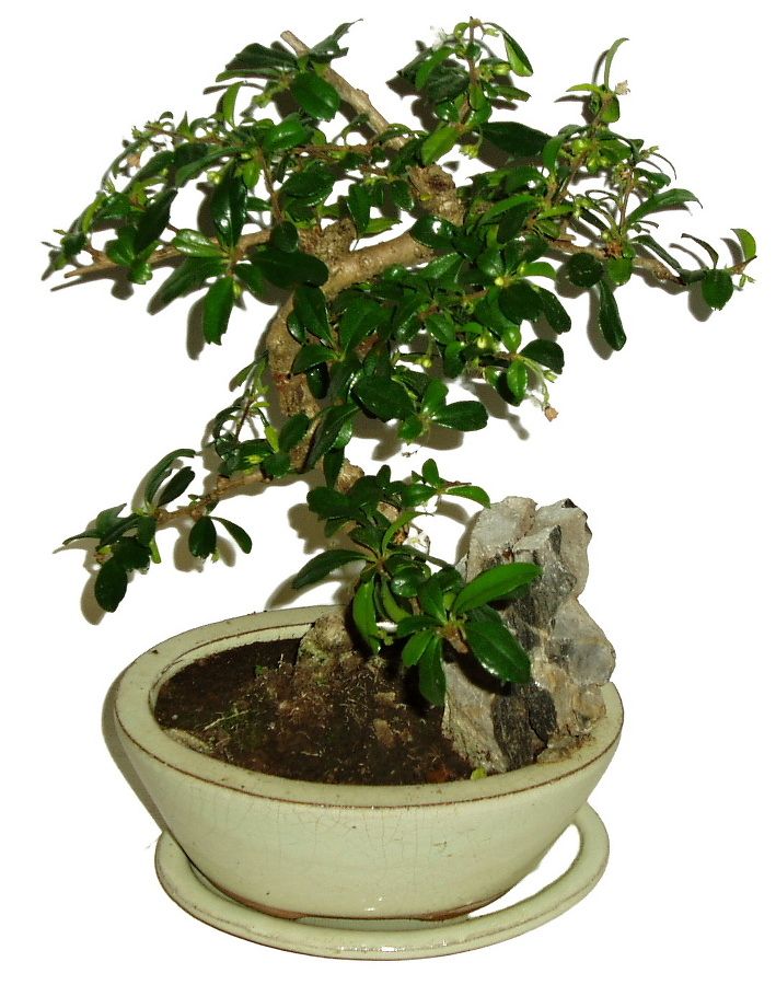 Velmi oblíbená bonsaje pro svoji nenáročnost, vzhled a hezké květy. Výborně tvarovatelná. Výška bonsaje 30 cm a stáří bonsaje 8 let. Ze zadní strany uštíplá miska.