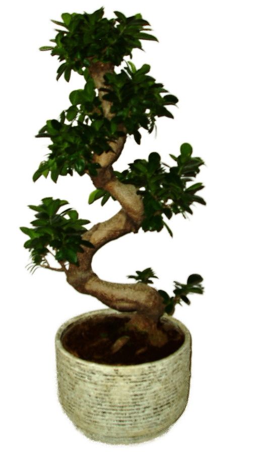 Ficusy ginsengy jsou výborné pokojové bonsaje, které nevyžadují žádnou péči, zálivka je velmi sporadická jednou za čas po celkovém vyschnutí. Výška pokojové bonsaje je 74 cm, stáří 15 let.